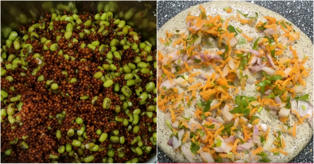 ഈയൊരു ദോശ തയ്യാറാക്കാനായി അരക്കപ്പ് അളവിൽ റാഗിയും,അതേ അളവിൽ ചെറുപയറും നല്ലതുപോലെ കഴുകി വൃത്തിയാക്കിയ ശേഷം കുറഞ്ഞത് 8 മണിക്കൂർ നേരമെങ്കിലും വെള്ളത്തിൽ കുതിരാനായി ഇട്ടുവയ്ക്കുക. അതായത് രാവിലെയാണ് തയ്യാറാക്കാനായി ഉദ്ദേശിക്കുന്നത് എങ്കിൽ രാത്രി തന്നെ ഇത്തരത്തിൽ റാഗിയും ചെറുപയറും കുതിരാനായി വെള്ളത്തിൽ ഇട്ടു വയ്ക്കാവുന്നതാണ്. ശേഷം ഈ രണ്ടു ചേരുവകളും അരയ്ക്കുന്നതിന് മുൻപായി അതിലേക്ക് ഒരു ചെറിയ കഷണം ഇഞ്ചിയും, ഒരു വറ്റൽമുളകും, അരക്കപ്പ് തേങ്ങയും, ആവശ്യത്തിന് വെള്ളവും ഒഴിച്ച് വേണം അരച്ചെടുക്കാൻ. ഇത്തരത്തിൽ അരച്ചെടുത്ത മാവിലേക്ക് ആവശ്യത്തിന് ഉപ്പ് കൂടി ചേർത്ത് മാറ്റിവയ്ക്കാം.