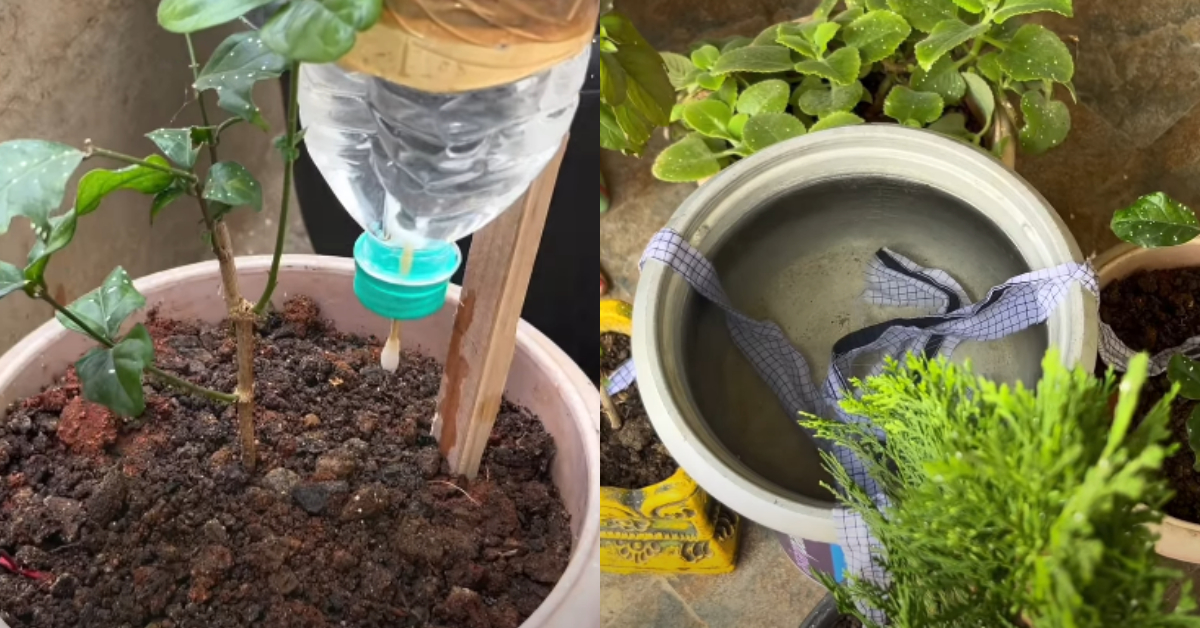 Easy Plant Self Watering System : വീടിനെ അലങ്കരിക്കാൻ ചെറുതാണെങ്കിലും ഒരു പൂന്തോട്ടം സെറ്റ് ചെയ്യുന്നവരാണ് ഇന്ന് മിക്ക ആളുകളും. ഇത്തരത്തിൽ പൂന്തോട്ടം സെറ്റ് ചെയ്തു കഴിഞ്ഞാൽ നേരിടേണ്ടി വരുന്ന പ്രധാന പ്രശ്നങ്ങളിൽ ഒന്ന് യാത്രകളും മറ്റും പോകുമ്പോൾ ചെടികൾക്ക് ആവശ്യമായ വെള്ളം കൊടുക്കാൻ സാധിക്കില്ല എന്നതാണ്. മിക്കപ്പോഴും ടൂറെല്ലാം കഴിഞ്ഞ് തിരിച്ചെത്തുമ്പോഴേക്കും പകുതി ചെടികളും കരിഞ്ഞു പോകുന്ന അവസ്ഥയാണ് സംഭവിക്കുക. എന്നാൽ ഇത്തരത്തിൽ ദീർഘദൂര യാത്രകൾ പോകുമ്പോൾ ചെടികൾക്ക് ആവശ്യത്തിന് വെള്ളം കിട്ടാനായി ചെയ്തു നോക്കാവുന്ന ചില ട്രിക്കുകൾ വിശദമായി മനസ്സിലാക്കാം.