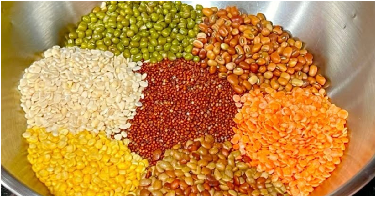 ഈയൊരു പലഹാരം തയ്യാറാക്കാനായി ആവശ്യമായിട്ടുള്ള പ്രധാന ചേരുവകൾ ഒരു കപ്പ് അളവിൽ റാഗി, രണ്ട് ടീസ്പൂൺ അളവിൽ ഉഴുന്ന്, പച്ച പയർ, സാമ്പാർ പരിപ്പ്, വെള്ള പയർ, മുതിര, ഉലുവ ഇത്രയും സാധനങ്ങളാണ്. ആദ്യം തന്നെ എടുത്തുവച്ച എല്ലാ ധാന്യങ്ങളും നല്ലതുപോലെ കഴുകി വൃത്തിയാക്കിയ ശേഷം കുറഞ്ഞത് 6 മണിക്കൂറെങ്കിലും വെള്ളത്തിൽ കുതിരാനായി ഇട്ടുവയ്ക്കുക. കുതിർത്തിയെടുത്ത എല്ലാ ധാന്യങ്ങളും മിക്സിയുടെ ജാറിലേക്ക് ഇട്ട് ദോശമാവിന്റെ പരുവത്തിൽ അരച്ചെടുക്കാം. ശേഷം അരച്ച് വെച്ച മാവ് ഫെർമെന്റ് ചെയ്യാനായി മാറ്റിവയ്ക്കാം.